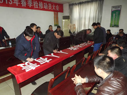 此次检修计划工期15天,会议号召广大员工克服困难,全力打好检修攻坚战,为2013年新年伊始的安全生产“开好头、起好步”。王总提出了“平安检修,人人有责”的主导思想,为此次检修工作指明了方向,同时他要求各检修小组在检修期间开展“个人无违章、班组无事故”竞赛活动,“赛安全,比质量;赛节约,比成本;赛效率,比作风;赛业绩,比奉献”,努力打造一支“重安全、守纪律”的优秀队伍。各参会人员还在“平安检修,人人有责”的宣传条幅上郑重签名,作出承诺。此次大会,为2013年的安全生产奠定了坚实基础。