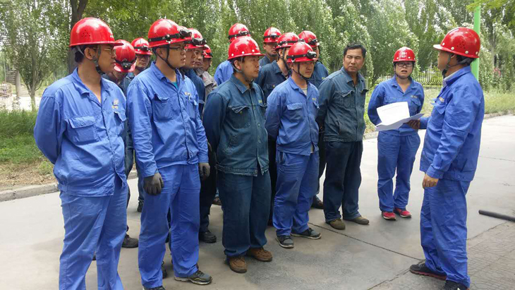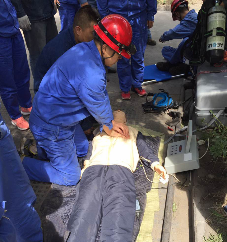 大家在明确了比赛规则和内容后,立刻投入到紧张的比赛中,在不断地“加油”、“快跑”呐喊声中,第一组的人员从厂房南门迅速冲到了阀门井附近开始进行急救,将“伤员”从阀门井中救出放在担架上,然后对橡皮人进行人工呼吸抢救。看似简单的流程,其中有很多要点,比如正压式呼吸器的佩戴、使用方法,橡皮人的按压法及人工呼吸时注意的问题。